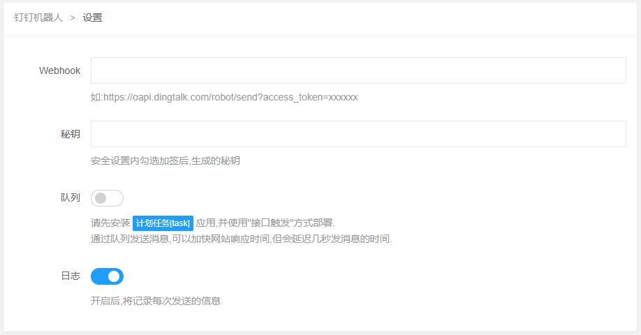 webhook:自定义webhook网址,默认为应用设置中的webhook