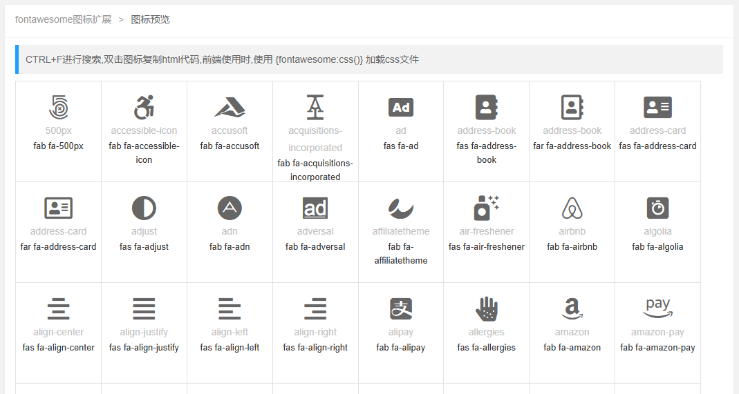后台主页 CTRL+F进行搜索,双击图标复制html代码,前端使用时,使用 {fontawesome:css()} 加载css文件