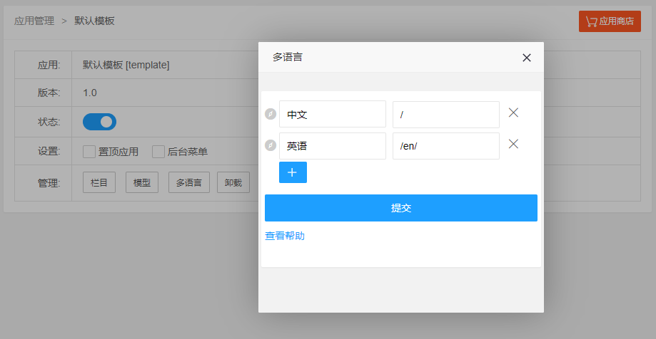 如为默认模板增加一个英语版本,路径为 /en/,则英语模板路径为/app/template/en/